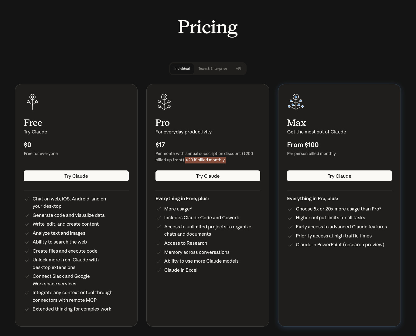 Cost: $20/month Pro. $100/month Max 5x. $200/month Max 20x. Teams require Premium seats at $125/user/month for full Claude Code access.
