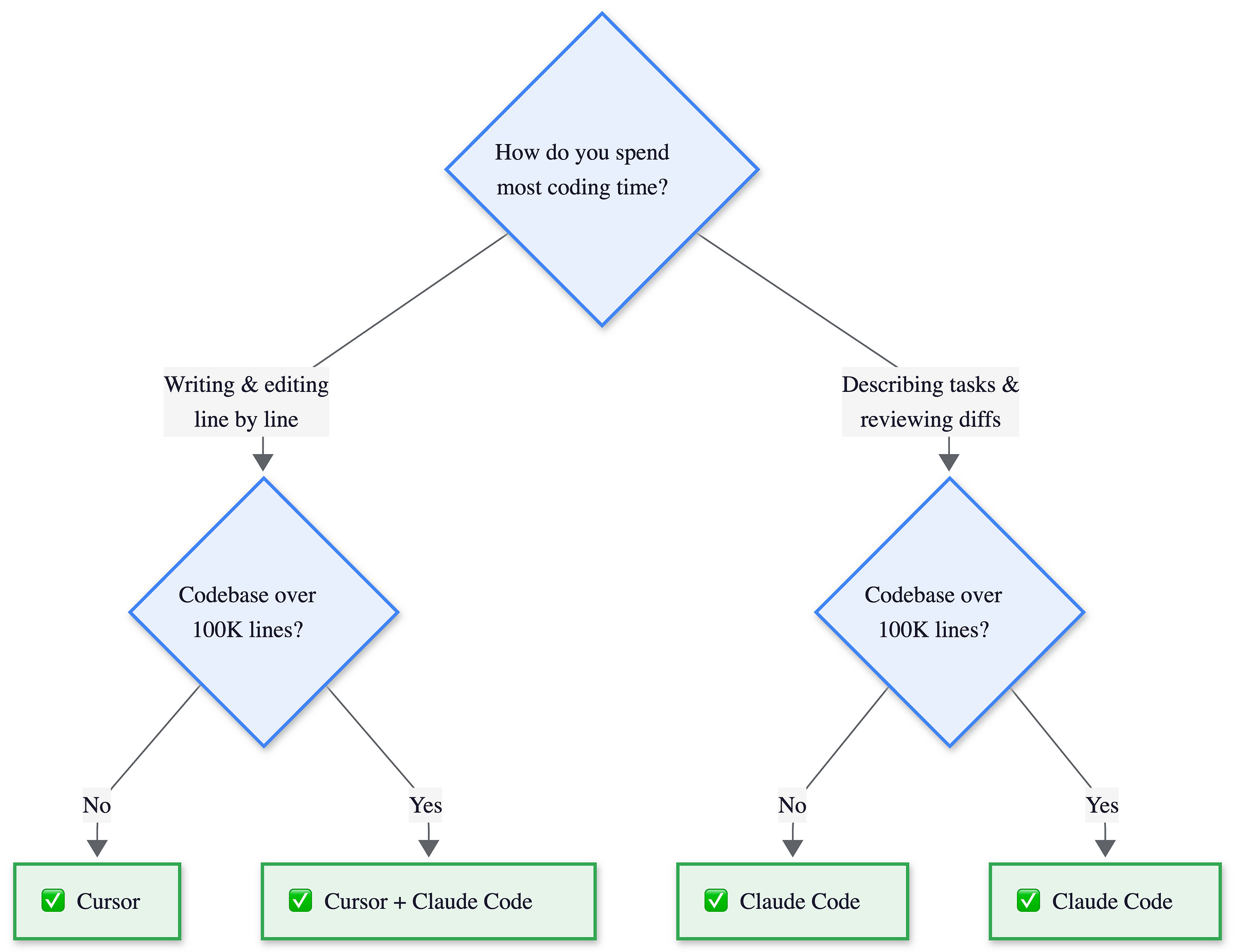 Autonomy level. How much do you want the AI to drive? Think about your last ten coding tasks. If most were “change this function, update that test, rename this variable,” Cursor’s tab completions keep up with your keystrokes. If most were “refactor auth to use JWT across 14 files,” Claude Code takes the spec and runs. The answer isn’t about preference. It’s about what you actually spend your hours doing.