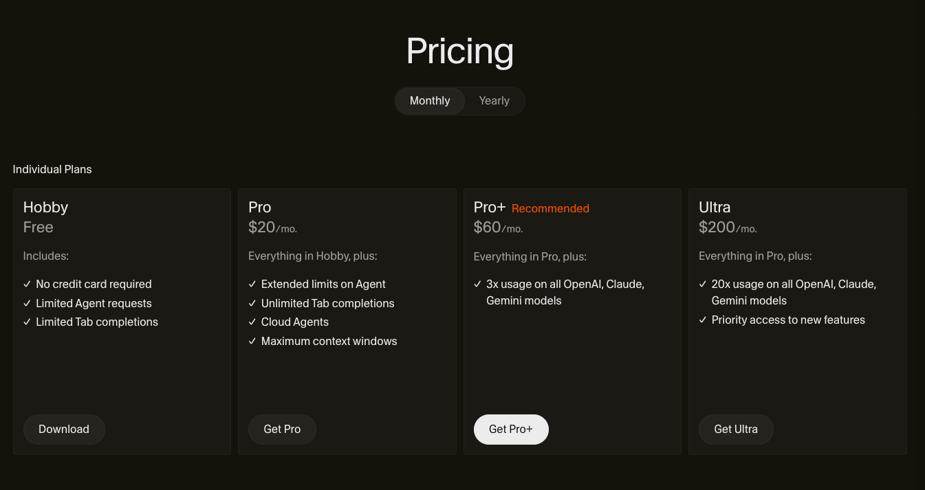 Cursor’s June 2025 pricing overhaul moved from request-based limits to a credit system, and the community hasn’t forgiven it1. Your $20/month Pro plan includes a credit pool. Auto mode (Cursor picks the model) is unlimited. But manually selecting premium models like Claude or GPT-5 burns credits fast. Heavy users report bills of $60-80/month without realizing they’d switched off Auto (ask me how I found out).
