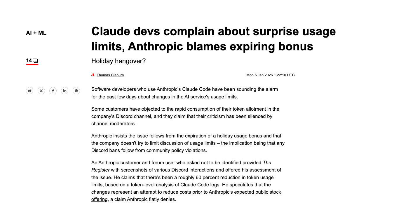 Developers reported hitting usage limits within 10-15 minutes of using Sonnet, with Opus becoming unavailable shortly after starting. Anthropic attributed it to the expiration of a holiday usage bonus. The Register.