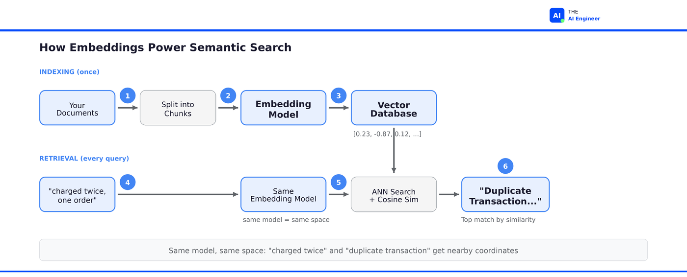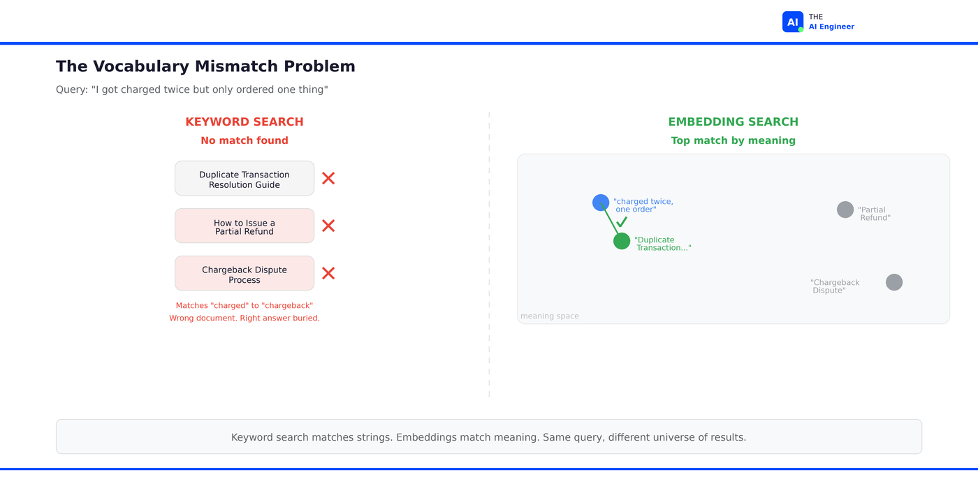 Even with stemming, synonym dictionaries, and fuzzy matching, no keyword engine connects “charged twice but only ordered one thing” to “duplicate transaction resolution.” The gap is conceptual, not lexical. And it’s the reason every AI search system, every RAG pipeline, and every recommendation engine on the planet now depends on the same core technology.