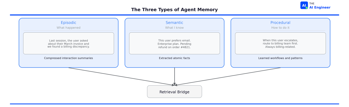 Episodic memory records what happened. “Last session, the user asked about their March invoice and we found a billing discrepancy.” These are compressed summaries of past interactions, not raw transcripts.
