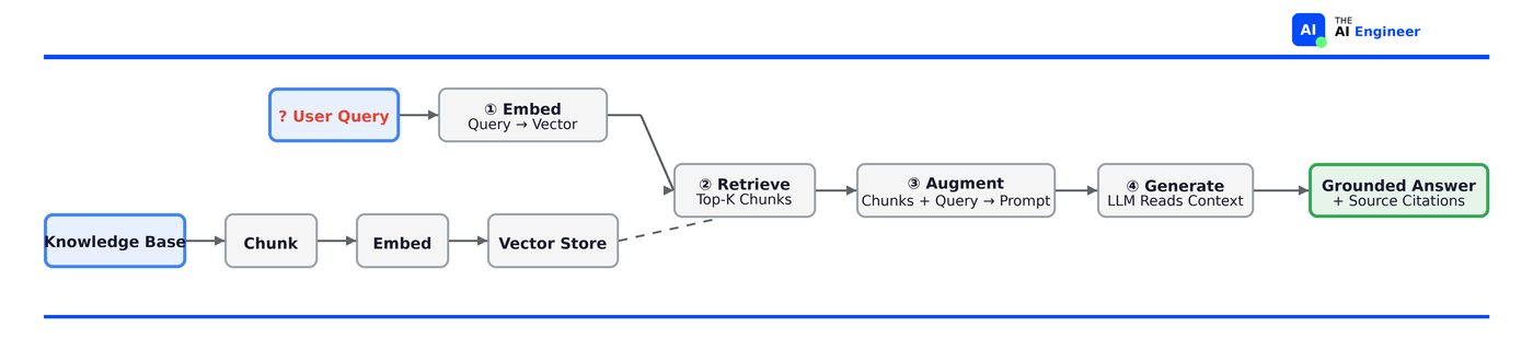 RAG is an open-book exam for AI. Instead of answering from memory (which is how LLMs hallucinate), the system retrieves relevant documents first, then generates an answer grounded in what it actually found.
